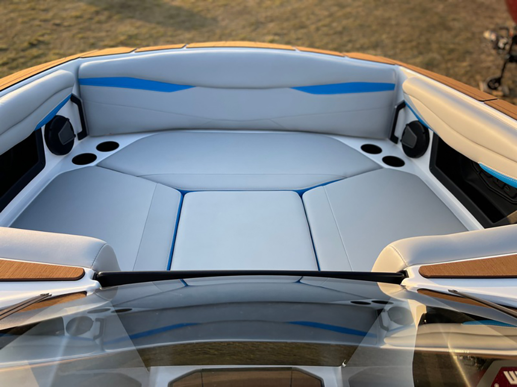 Make your mark this season with this zero-hour 2024 Axis A225, loaded with top-tier features and finished in Vapor Blue Metallic / Arctic White – a stunning and shimmering look on the water.