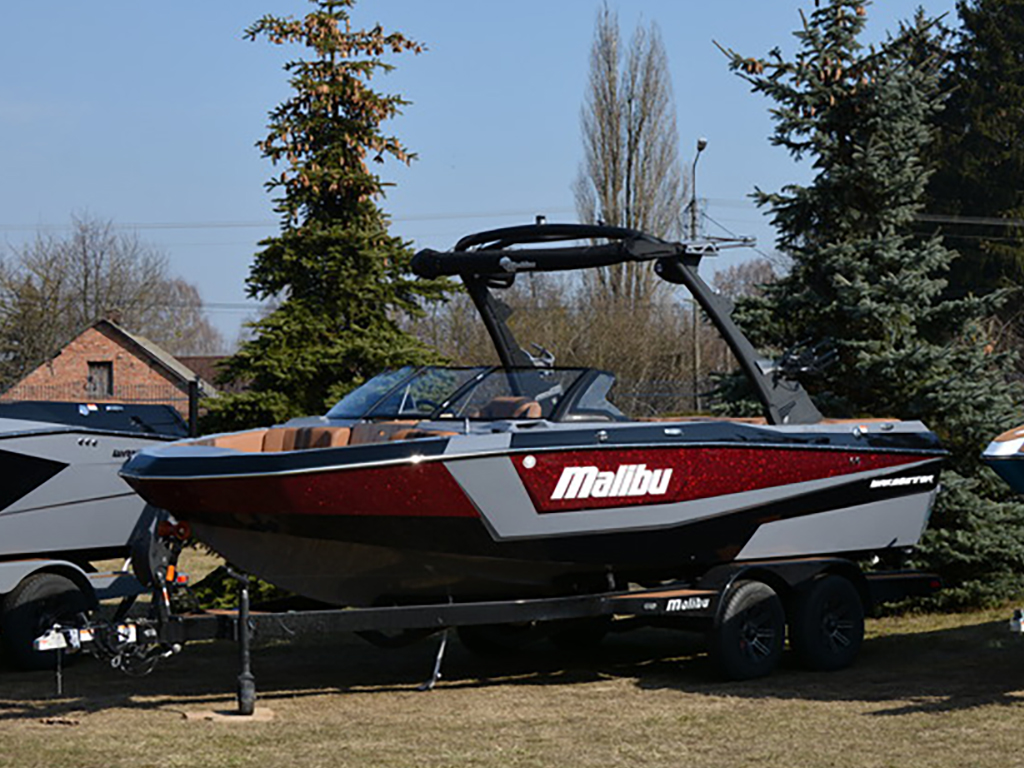 Turn heads on the water with this zero-hour 2025 Malibu 21 LX, beautifully finished in Ruby Red Metallic, Graphite, and Ebony Metallic – a striking and sophisticated colour combination.